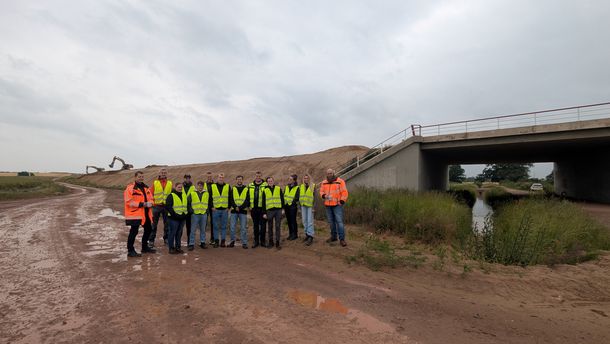 Nach freundlicher Begrüßung durch Vertreter:innen der Autobahn GmbH- Niederlassung Ost, erhielt die Gruppe einen fachlich fundierten Überblick zur Planung und zum Bau des neuen Autobahnabschnittes. Die A 14 soll langfristig eine durchgehende Verbindung zwischen Wismar und Leipzig schaffen und ist mit ihren rund 155 Kilometern das aktuell größte deutsche Autobahnneubauprojekt. Die Autobahn ist ein zentraler Bestandteil für den Lückenschluss im mitteldeutschen Verkehrsnetz.