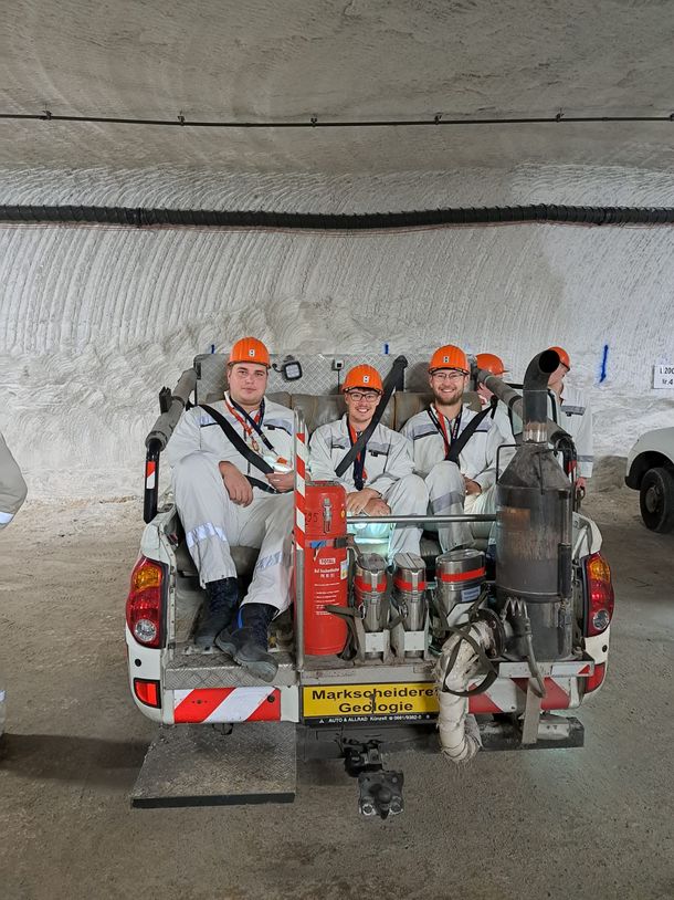 Im unterirdischen Bergwerk erhielten die Studierenden detaillierte Informationen über die eingesetzten geodätischen Überwachungsmethoden zur Gewährleistung der Standsicherheit des Grubenbauwerks. Dabei wurde insbesondere auf das sogenannte Markscheidewesen eingegangen, ein Spezialgebiet der Vermessung, das sich mit der Planung und Kontrolle von Abbaubetrieben unter Tage befasst. Die Ausmaße der Hohlräume, die teils mehrere zehntausend Kubikmeter umfassten, waren ebenso beeindruckend wie die technische Präzision, mit der hier gearbeitet wird.