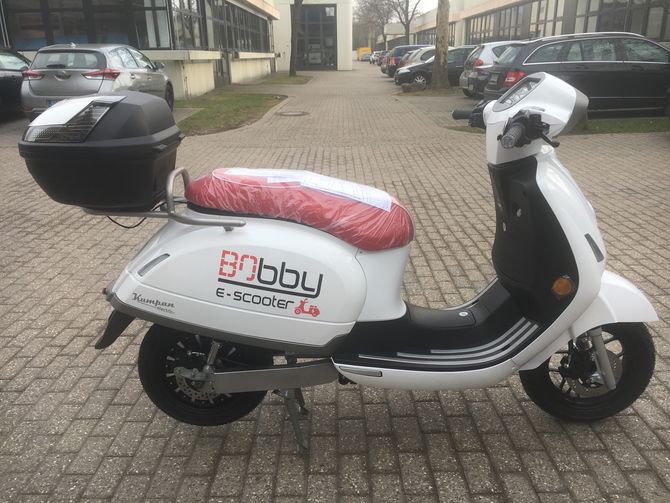 Today we received our second vehicle. This time it was a model of the Kumpan company. The scooter is made in Germany and while it is a bit more expensive than the NIU, it is much better in equipment and workmanship. Besides the touch screen, two exchangeable batteries and the color combination of our university, we are especially happy about our logo on the side.