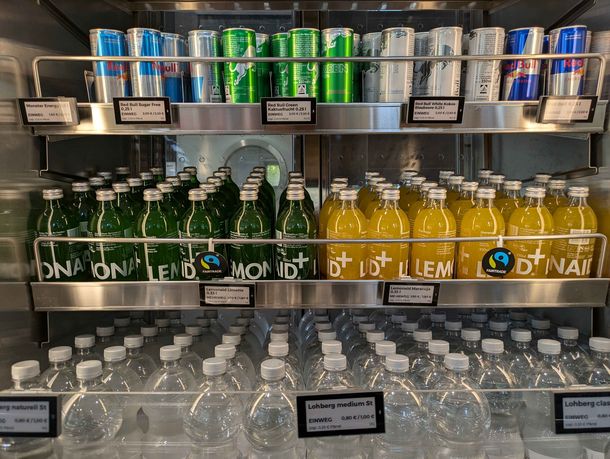 - In den Automaten in der BO Lounge gibt es fairen Kaffee, “Die Gute Schokolade” (eine Tafel Bio-Vollmilchschokolade), schokoladige Erdnüsse von Treets Peanuts und Manner-Waffeln (vegan)