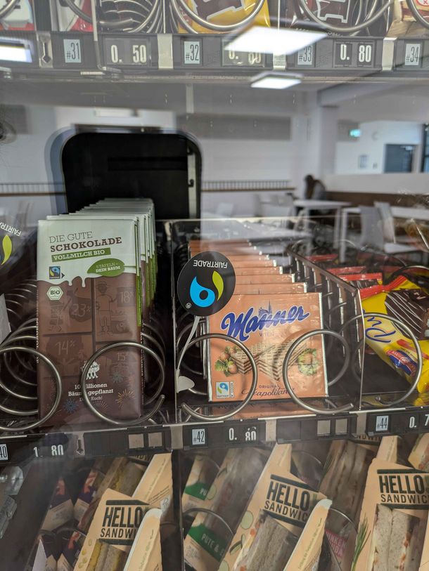 - In den Automaten auf der Mensaempore gibt es fairen Kaffee, “Die Gute Schokolade” (eine Tafel Bio-Vollmilchschokolade), schokoladige Erdnüsse von Treets Peanuts und Manner-Waffeln (vegan)