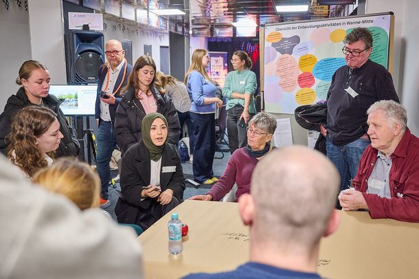 Mit einem vielseitigen Angebot lud die Stadt Herne am 20.10.2025 zum Quartiersforum Wanne-Mitte ein. Das Quartiersforum ist ein gemeinsames Austauschformat der Stabstelle „Zukunft der Gesellschaft“ im Büro des Oberbürgermeisters der Stadt Herne und des Bezirksbürgermeisters, stellvertretend für die Bezirksvertretung Wanne, das mehrmals im Jahr stattfindet. Bei der Veranstaltung können sich interessierte Menschen (inkl. Akteurslandschaft) aus Wanne-Mitte über die neusten Entwicklungen im Quartier informieren, sich miteinander austauschen, netzwerken und gemeinsam neue Ideen für das Quartier Wanne-Mitte entwickeln.