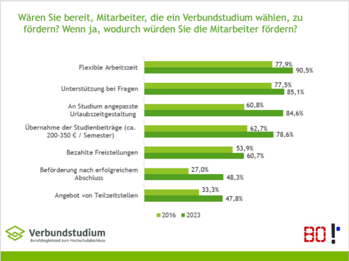 Positiv für Studieninteressierte: im Vergleich zu einer Befragung aus dem Jahr 2016 sind die Unterstützungsleistungen der Arbeitgeber für die ausbildungs- bzw. berufsbegleitenden Studierenden durch die Arbeitgeber deutlich gestiegen. Unternehmen, die das Verbundstudium kennen, empfehlen das Studium neben Beruf oder Ausbildung aktiver ihren Mitarbeitenden und fördern sie häufiger mit einer Vielzahl an Maßnahmen.Insgesamt würden bspw. rund 80 % der Unternehmen, die Mitarbeiter fördern möchten, Studienbeiträge übernehmen. Zudem würden über 60 % der Unternehmen das ausbildungs- oder berufsbegleitende Studium ihrer Mitarbeiter mit bezahlter Freistellung unterstützen. Jeweils ca. 50 % würden darüber hinaus während des Studiums den Studierenden eine Teilzeitstelle anbieten und/oder nach erfolgreichem Abschluss eine Beförderung ermöglichen.
