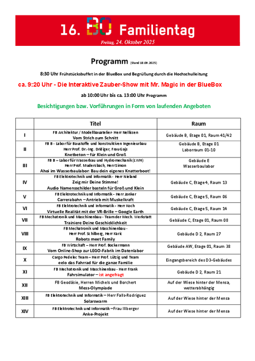 Die Hochschule Bochum lädt an diesem Tag alle Angehörigen der Mitarbeiter*innen und der Studierenden ein, um die Hochschule und ihre Fachbereiche kennenzulernen. Ein bunter Mix aus Mitmachaktionen, Vorführungen und Kinderaktivitäten bringt seit Jahren Groß und Klein zusammen.