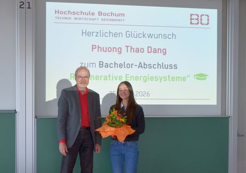 Die Hochschule Bochum und alle am Studiengang Regenerative Energiesysteme Mitwirkenden gratulieren Frau Dang sehr herzlich zum Bachelorabschluss und wünschen ihr viel Erfolg im Masterstudium und in ihrer beruflichen Tätigkeit.