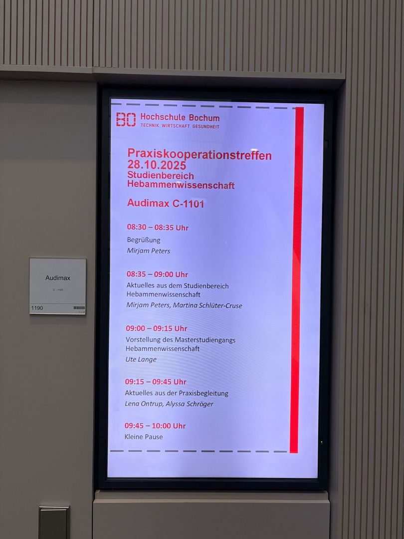 Am 28. Oktober 2025 kamen Kooperationspartner*innen aus der klinischen und außerklinischen geburtshilflichen Versorgung zum Praxiskooperationstreffen (PKT) des Studienbereichs Hebammenwissenschaft an der Hochschule Bochum zusammen. Das halbjährlich stattfindende Treffen hat sich längst als fester Bestandteil des fachlichen Dialogs zwischen Hochschule, Praxis und Forschung etabliert und bot auch in diesem Herbst wieder spannende Einblicke in aktuelle Entwicklungen der Hebammenwissenschaft und des Studienbereichs.