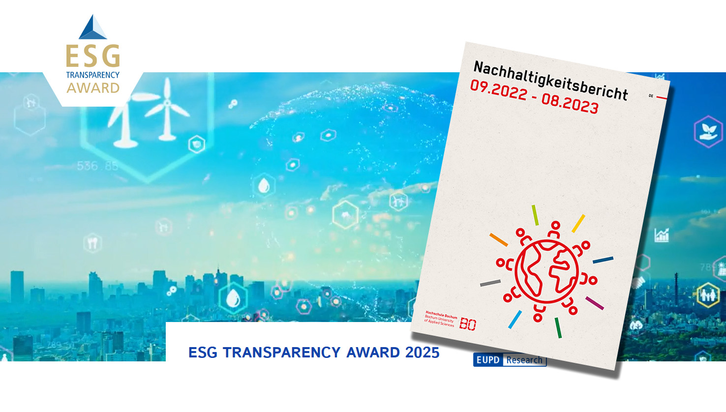 Dass der Nachhaltigkeitsbericht der Hochschule Bochum eine gelungene Veröffentlichung ist, werden sicherlich viele Hochschulangehörigen sagen, die in dieses 70 Seiten starke Heft schon einmal einen Blick geworfen oder es gar mitgestaltet haben. Jetzt können sie auch offiziell feststellen, dass er ausgezeichnet ist: Am 26. November erhielt die Hochschule für ihren Bericht den ESG Transparency Award 2025 der EUPD Group.