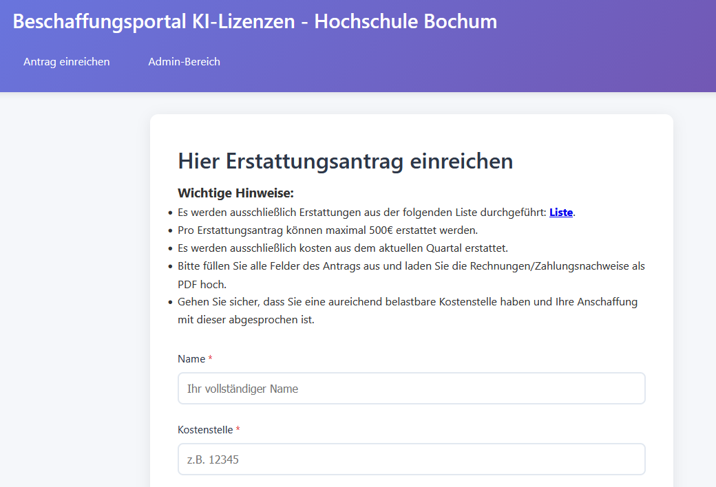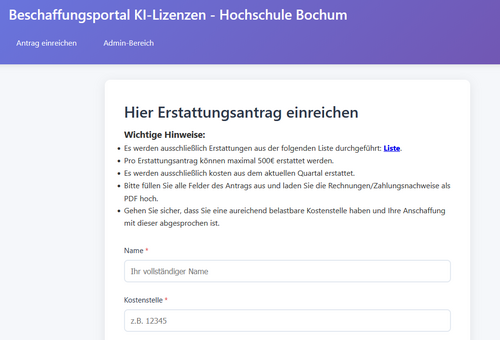 Da aktuell kein zentrales Budget für KI-Lizenzen vorgesehen ist, werden die Kosten zunächst von den Mitarbeitenden selbst übernommen. Eine nachträgliche Erstattung ist anschließend über das Beschaffungsportal „KI-Lizenzen“ möglich.