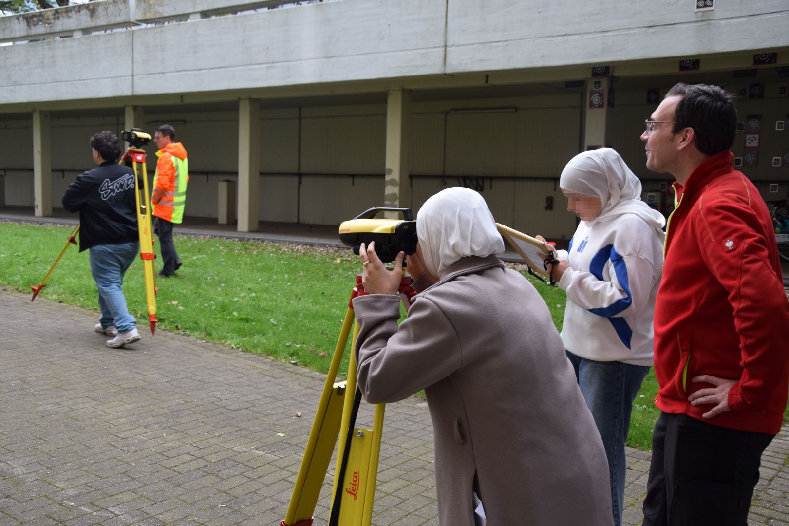 Im Außenbereich des AW-Gebäudes führten die Kleingruppen schließlich die typischen Handgriffe aus – Aufbau des Stativs, Ausrichten des Instruments, Festlegen der Zielweiten. Die Personen an den Nivellierlatten konnten ein ruhiges Händchen beweisen, indem sie die Latten während der Messung lotrecht aufhielten, während die Personen an den Instrumenten die Lattenablesungen durchführten und diese fachgerecht in ein Feldbuch eintrugen. Zu Beginn wurden die verschiedenen Tätigkeiten noch durchgewechselt, doch in manchen Gruppen ergaben sich schnell Lieblingsaufgaben, die niemand hergeben wollte. Als Bonus wurde anschließend die Neigung einer Feuerwehrzufahrt bestimmt und alle Gruppen waren sich einig, dass die Steigung knapp 6% betrug.