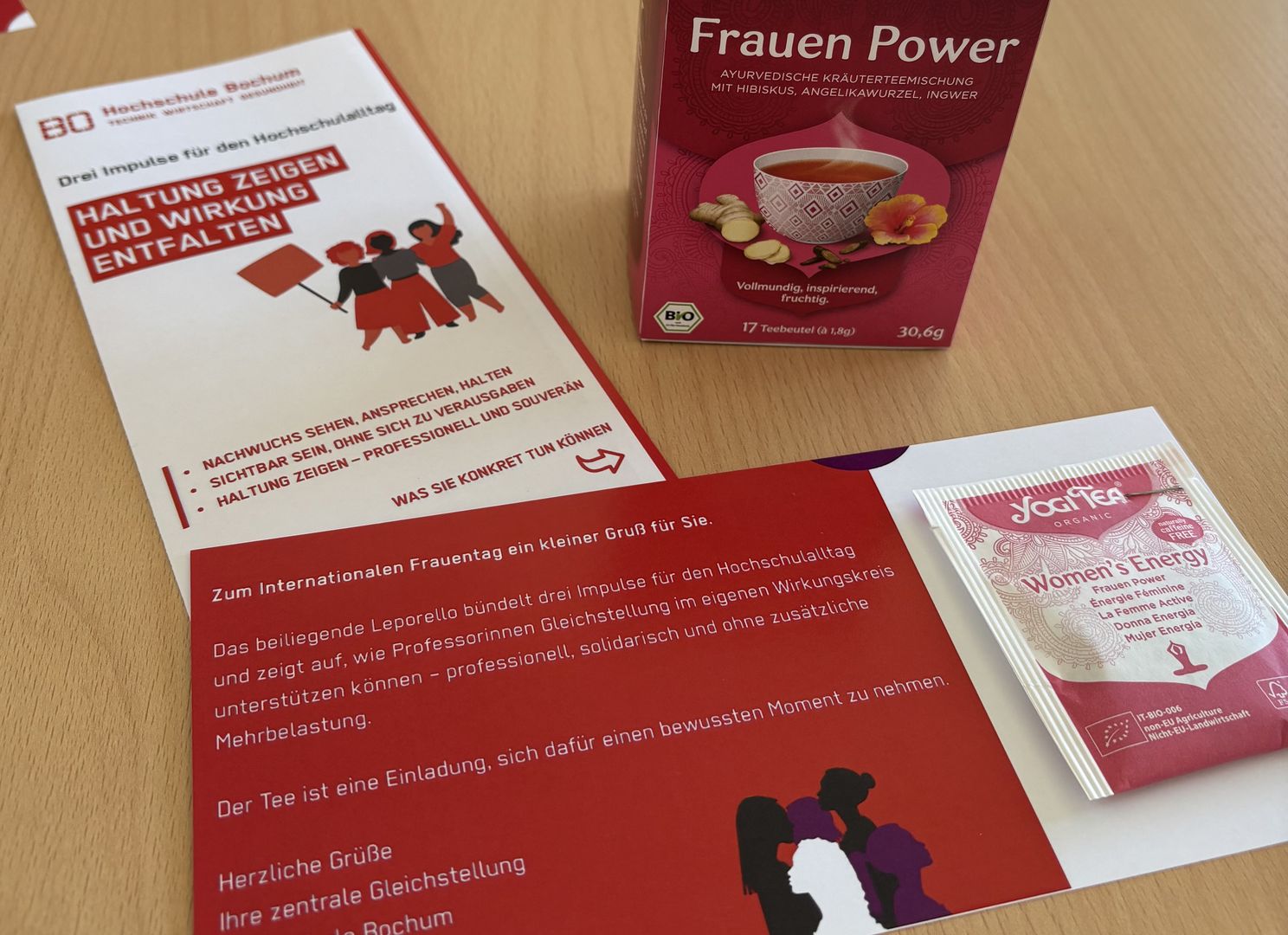 Anlässlich des Internationalen Weltfrauentags am 8. März verschickt die Zentrale Gleichstellung eine kleine Aufmerksamkeit an alle Professorinnen. Enthalten sind eine Grußkarte, ein Leporello mit drei praktischen Impulsen für den Hochschulalltag sowie ein Teebeutel.