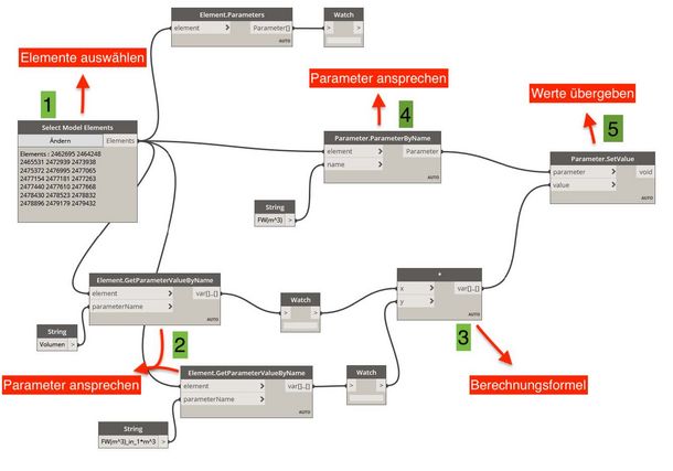 Das Tragwerksmodell enthält lediglich Elemente, die das Tragwerk betreffen. Aussparungen und Durchbrüche, die beispielsweise für Türen im Architekturmodell, oder Leitung im Lüftungsmodell notwendig sind, wurden vorgenommen. Die Bauteile des Modells wurden mit zusätzlichen Informationen angereichert und über die IFC-Schnittstelle mitexportiert. Um Angaben zum nicht erneuerbaren Primärenergiebedarf, Wasserverbrauch und dem Treibhauspotential den Bauteilen anzufügen, wurde die graphische Programmierschnittstelle Dynamo verwendet. Was in Dynamo erarbeitet wurde, kann auch auf andere Ökoeigenschaften für das gesamte Gebäude durch minimale Anpassung angewendet werden.