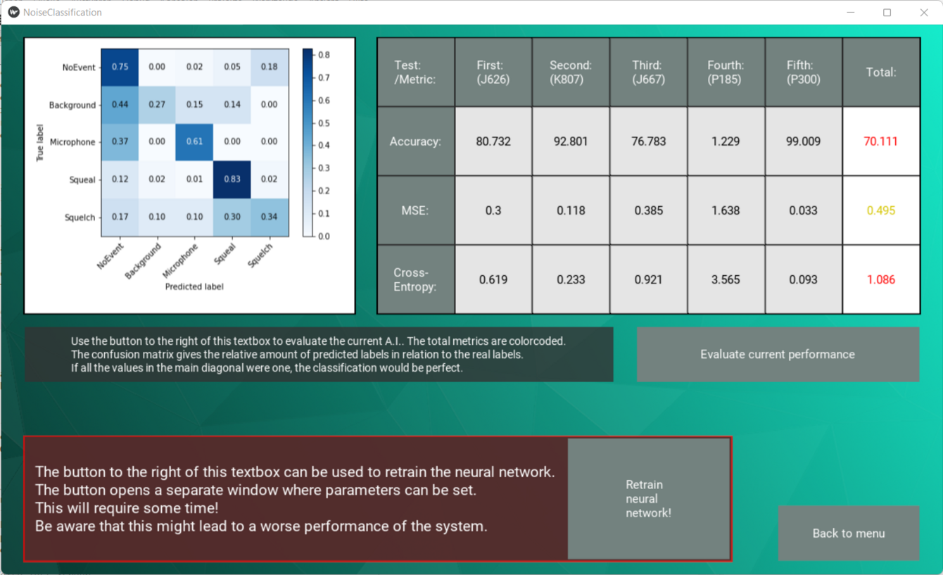 Weil die Art der auftretenden Geräusche Rückschlüsse über mögliche Gegenmaßnahmen zulässt, soll ein Programm entwickelt werden, mit dem die aufgezeichneten Geräuschen von (vorerst) Prüfstandtests automatisiert klassifiziert werden können.