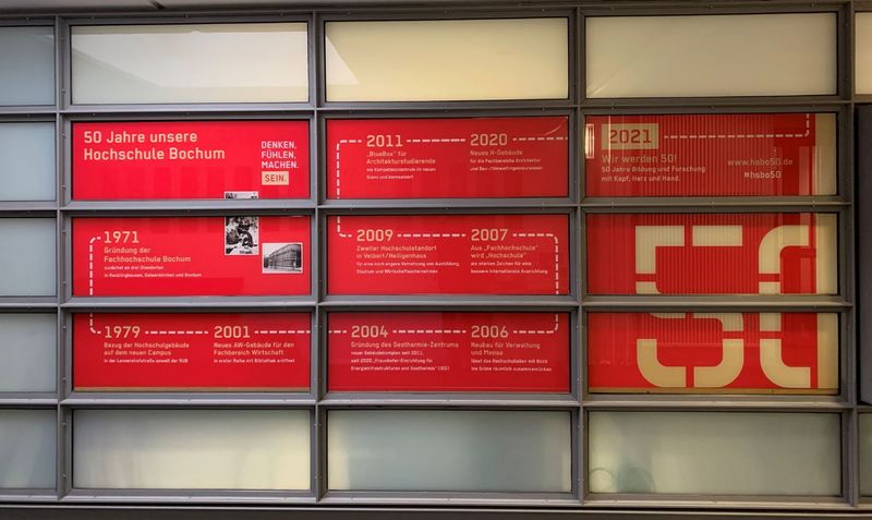 Die markantesten baulichen Entwicklungen von 1971 bis 2021 sind in BO-Rot und ein bisschen Gold schon jetzt für alle, die die Hochschule betreten, sichtbar. Auch wenn Corona-bedingt zur Zeit die Frequentierung des Haupteingangs und der Magistrale auf ein Minimum reduziert ist, so sieht er doch schon ganz feierlich aus, unser Infopoint.