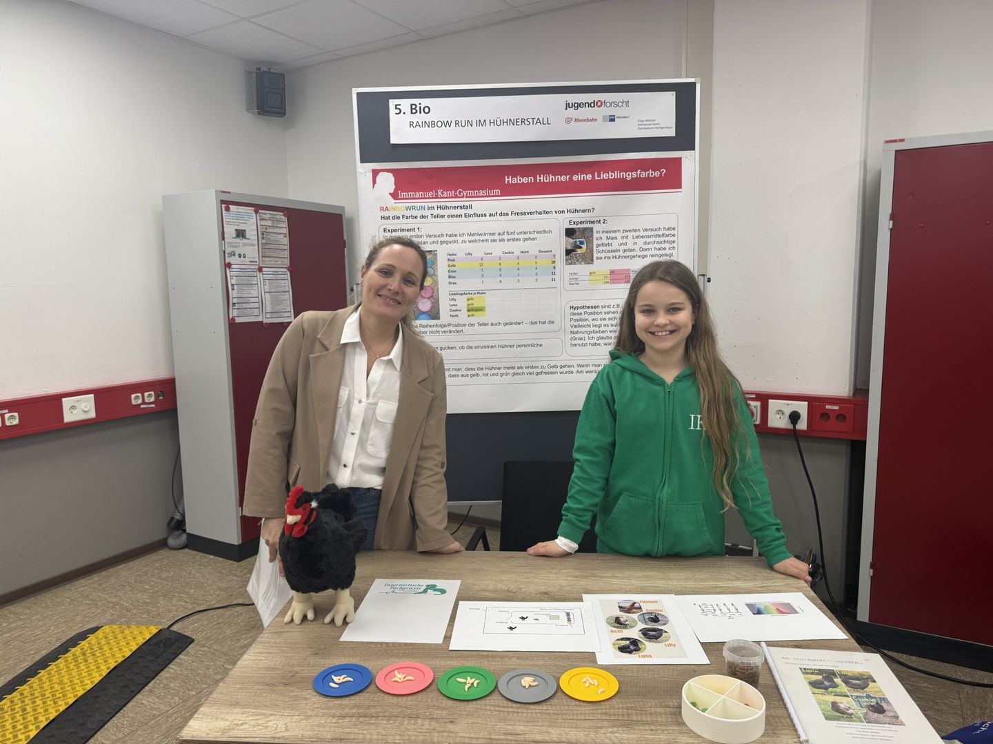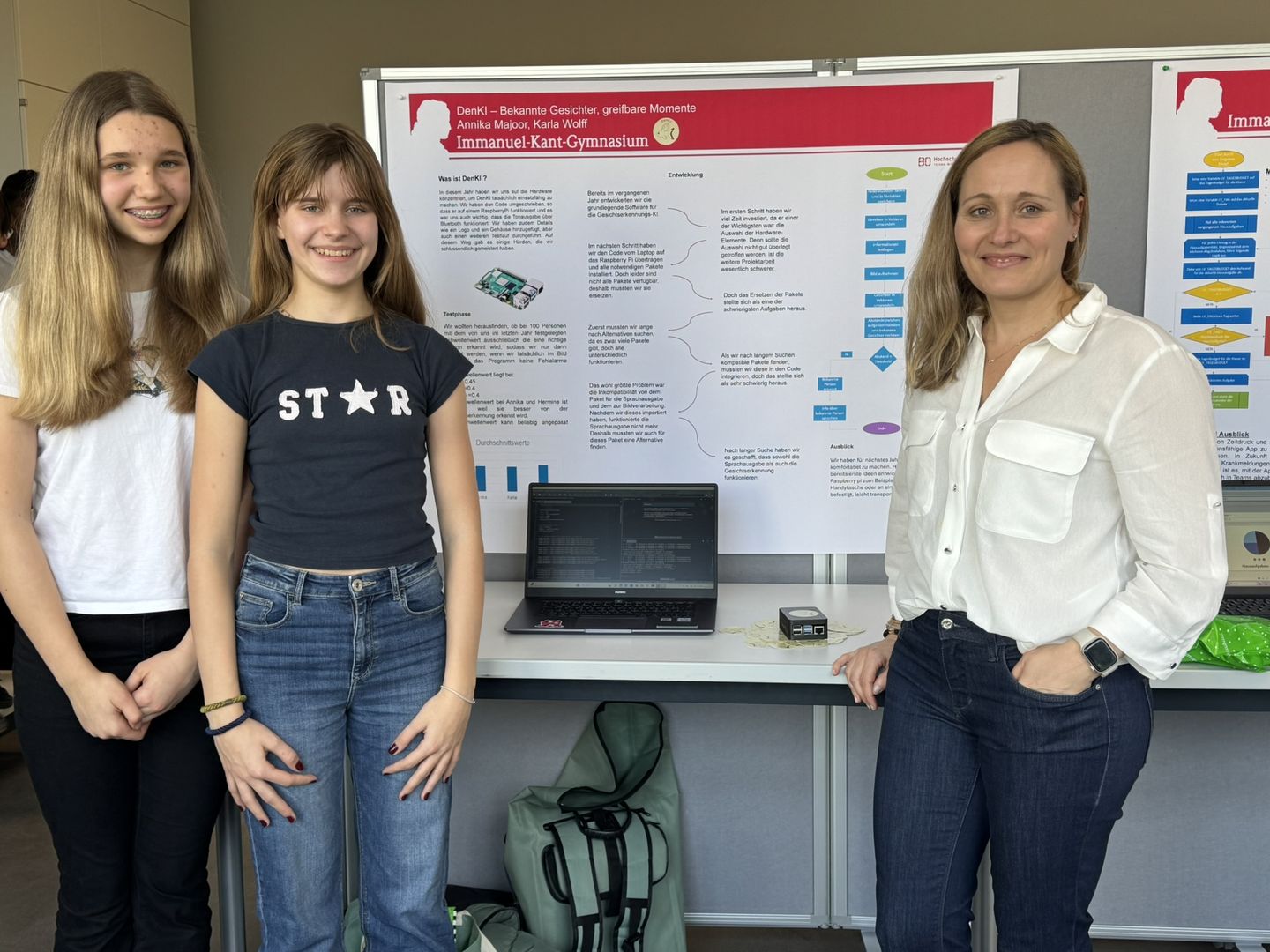 Die präsentierten Arbeiten waren dabei so vielfältig, wie die Schüler*innen selbst: Erste Preise vergab die Jury an zwei Projekte des IKG, nämlich „Zamir – Musikvisualisierung in VR: Musik, die du sehend fühlst“ und „Lofi – Das neue Klassik“. Diese beiden Projekte werden demnach das IKG auch bei der Landesrunde vertreten. Besonders eng von der Hochschule betreut – und ebenfalls mit Preisen ausgezeichnet – wurden das Projekt „CloudPhone“ von Joos Menken (7. Klasse), der mit seiner neuartigen Idee von zentral gehosteten Smartphones beeindruckt und großartiges technisches Know-How zeigt. Ziel ist ein Gerät, das lokal nur die wichtigsten Aufgaben wie Anzeige, Eingabe und Netzwerk übernimmt, während komplexe Berechnungen auf einem zentralen leistungsstarken Server ausgeführt werden. Die Jury prämierte dieses technisch anspruchsvolle Anwendungsprojekt mit einem 3. Preis in der Kategorie Mathematik/Informatik und einem Sonderpreis. In der gleichen Kategorie erreichten Karla Wolff und Annika Majoor (ebenfalls 7. Klasse) sogar einen 2. Preis für ihr Projekt „DenKI – Vertraute Gesichter, greifbare Momente“, das Demenz-erkrankten Menschen mittels KI helfen soll, ihre Angehörigen zuerkennen und Erinnerungen zu reaktiveren. Die Schülerinnen haben den Code aus dem Wettbewerb 2025 weiterentwickelt und so umgeschrieben, dass er auf einem Raspberry Pi funktioniert. Dadurch können demenzkranke Personen die Gesichtserkennung auf einem portablen Gerät durchführen lassen und die Informationen zu den Angehörigen anschließend als Sprachausgabe erhalten. Mit diesem Projekt zeigen die beiden Schülerinnen nicht nur ihre Technik-Skills, sondern auch, wie KI helfen kann, soziale und gesundheitliche Herausforderungen im Alter zu lösen. Weitere spannende und erfolgreiche Projekte waren die Arbeit „Rainbow Run im Hühnerstall“, bei der Finja Mietzel (2. Preis Biologie, 6. Klasse) der Frage nachging, ob Hühner eine Lieblingsfarbe haben, oder die Arbeit von Zoe Hess (2. Preis Arbeitswelt, 9. Klasse), die mit ihrem selbst programmierten „Schul-Concierge“ dafür sorgen möchte, dass es „nie zu viele Hausaufgaben“ gibt!