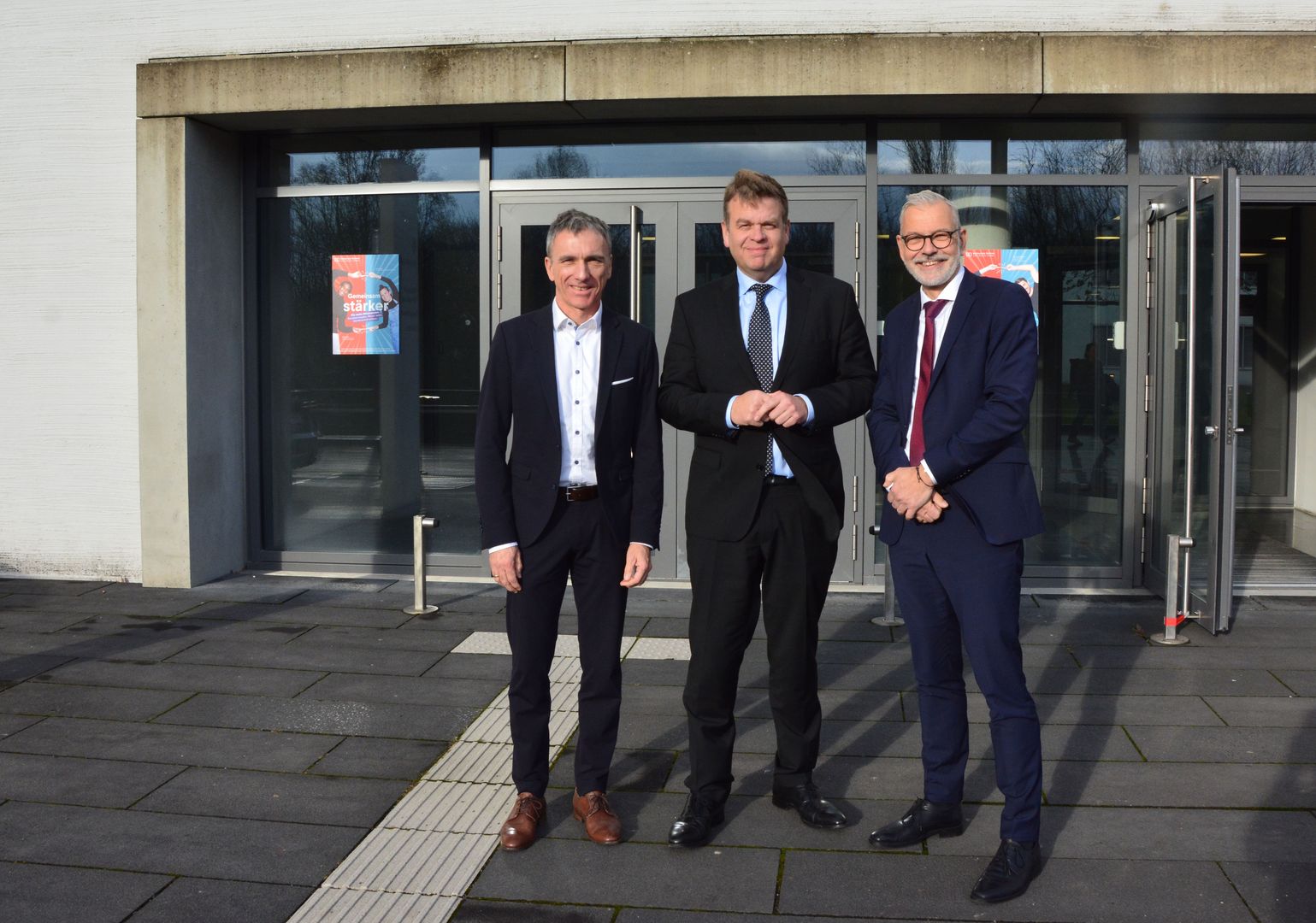 Am 4. Dezember 2025 empfing die Hochschule Bochum Staatssekretär Matthias Heidmeier aus dem Ministerium für Arbeit, Gesundheit und Soziales des Landes Nordrhein-Westfalen am Gesundheitscampus. Begrüßt wurde er vom Präsidenten der Hochschule Bochum, Prof. Dr. Andreas Wytzisk-Arens, dem Vizepräsidenten für Integration und Gesundheit, Prof. Dr. Sven Dieterich, sowie den Dekanen der beiden Gesundheitsfachbereiche.