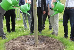 Die Hochschule Bochum hat diesen Anlass genutzt, das symbolträchtige Geschenk zu würdigen: Hochschulpräsident Prof. Dr. Jürgen Bock, Standortsprecher Prof. Christian Weidauer und Dr. Thorsten Enge, Geschäftsführer der Schlüsselregion haben den Baum gemeinsam begossen. Unterstützt wurden sie von Dr. Jan Heinisch, dem Bürgermeister der Stadt Heiligenhaus und Ansgar Bensch von der Stadt Velbert.