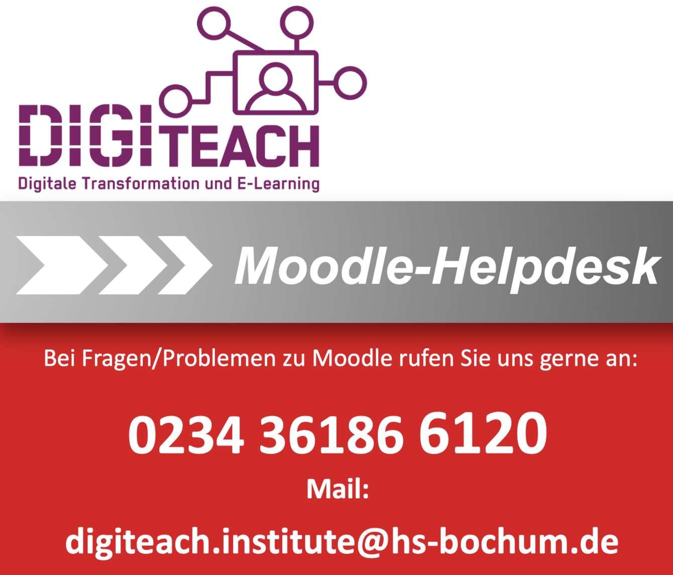 Im Rahmen der hochschulweiten Neuvergabe von Telefonnummern ändert sich auch die Nummer der Moodle Hotline (Moodle Helpdesk).