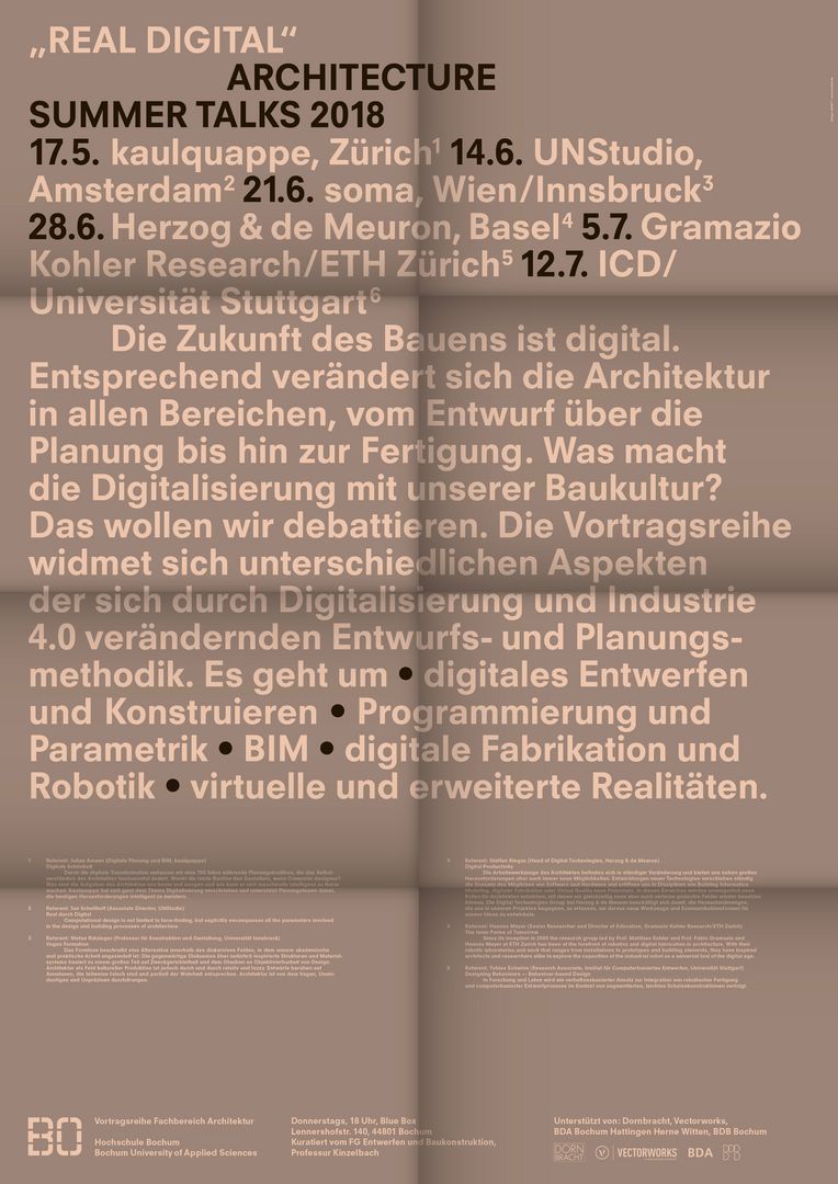 Die Zukunft des Bauens ist digital. Entsprechend verändert sich Architektur in allen Bereichen, vom Entwurf über die Planung und Fertigung bis hin zu ihrer Nutzung. Was macht die Digitalisierung mit unserer Baukultur? Die Hochschule Bochum greift diese Fragen in ihrer renommierten Vortragsreihe, den Summer Talks 2018 auf und gibt exemplarische Einblicke und Denkanstöße.