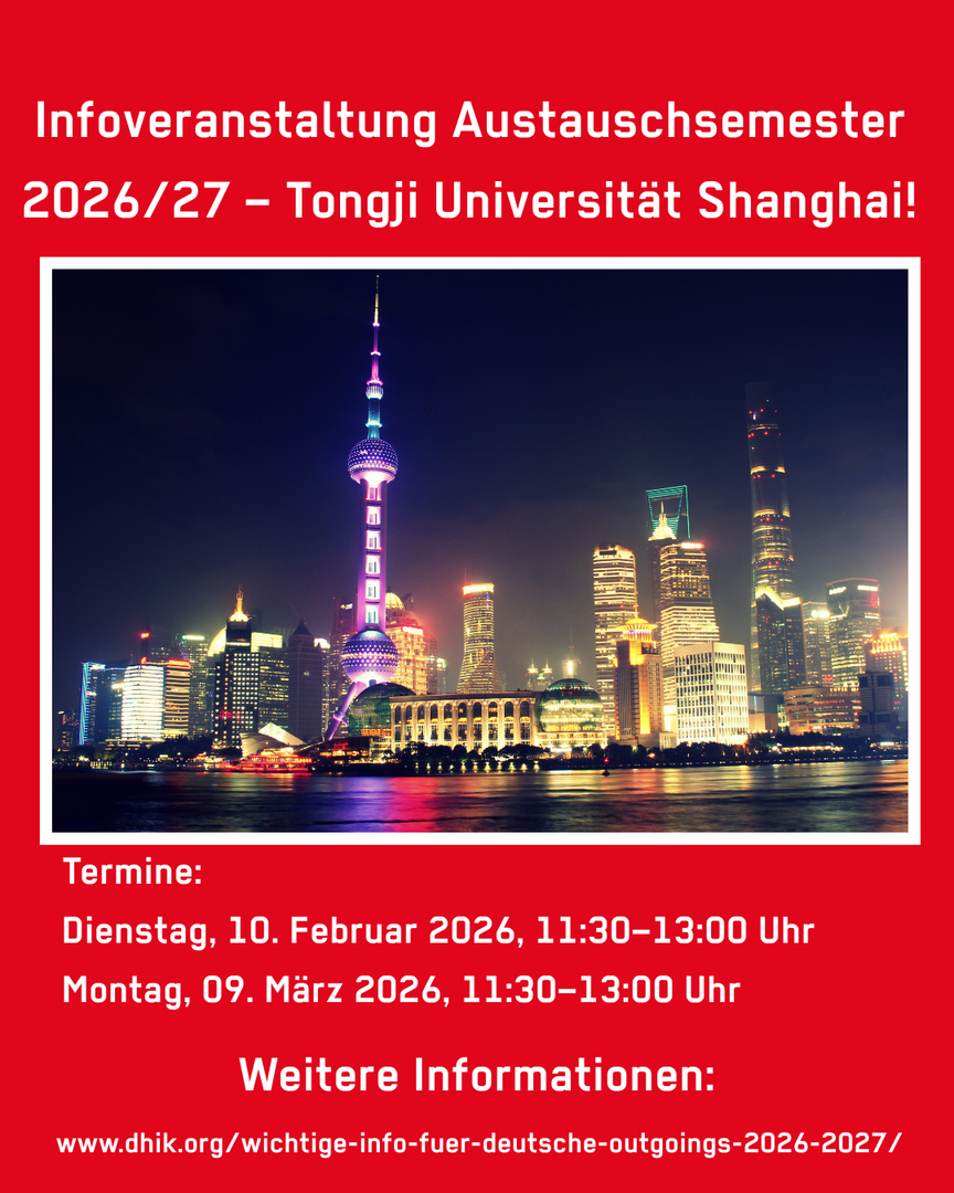 Das Deutsche Hochschulkonsortium für internationale Kooperationen (DHIK) bietet einige Termine an, um über Auslandsaufenthalte an der Togji Universität in China zu berichten.