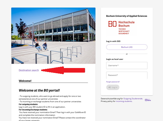 Klicken Sie zuerst auf "Exchange destinations abroad and feedback". Anschließend können Sie Ihren Fachbereich aus der Liste auswählen und die entsprechenden Hochschulen über "Search" finden. Bitte nicht “Bochum University of Applied Sciences” auswählen, sondern den entsprechenden Fachbereich/Fachrichtung.