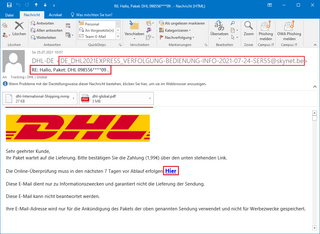 Am letzten Wochenende haben Nutzer*innen der HSBO eine Phishing-Mail von "DHL-DE" erhalten. Bitte öffnen Sie NICHT den Anhang/Link.