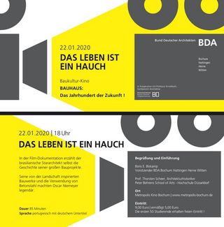 HEUTE: Oscar Niemeyer... im Baukulturkino. Mit dem Film „Das Leben ist ein Hauch“. Für die ersten 50 Studierenden an der Abendkasse übernimmt der BDA…