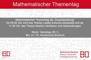 Ab 09:00 Uhr wird das Thema Lokale Extrema behandelt und ab 11:30 Uhr das Thema Newton-Verfahren und Abwandlungen. #isd