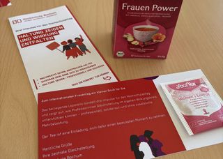 Die Zentrale Gleichstellung verschickt Grußkarte, Impuls-Leporello und Teebeutel als Zeichen der Wertschätzung.