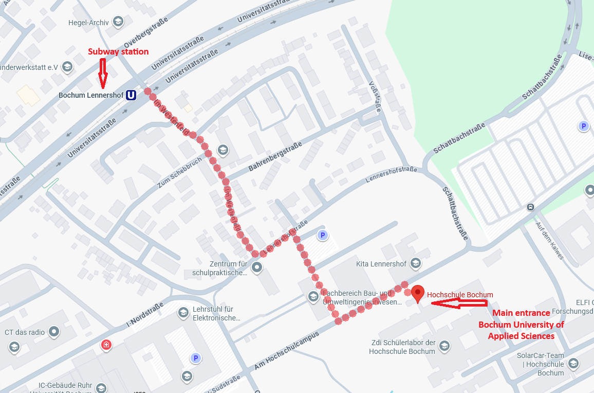 The best way to reach the central campus of Bochum University of Applied Sciences from Bochum city centre is to take the subway (U-Bahn) - Campus line U35, direction Hustadt. Get off the station “Lennershof” and, when you reach the upper elevator level, turn left. From there, it is a 5-10-minute walk to campus.
