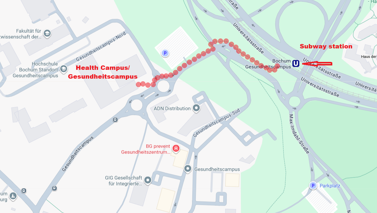 The best way to reach the Health campus from Bochum city centre is to take the subway (U-Bahn) - Campus line U35, direction Hustadt. Get off at the station “Gesundheitscampus”. When leaving the station, please follow the signs for “Gesundheitscampus”. The campus buildings are located on the terrace between the two roundabouts. The terrace can be accessed via stairs or by elevator.