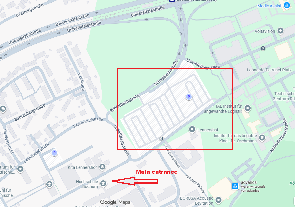 From Universitätsstraße, take the Uni-Ost / Fachhochschule exit. You will find a large parking lot on your left.
