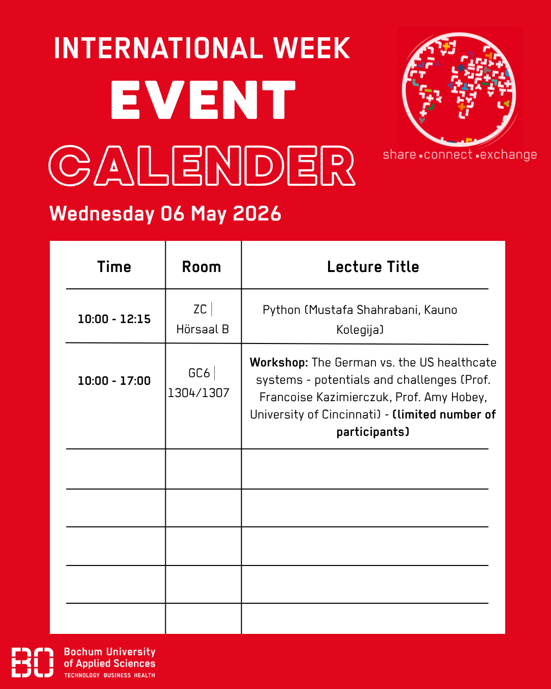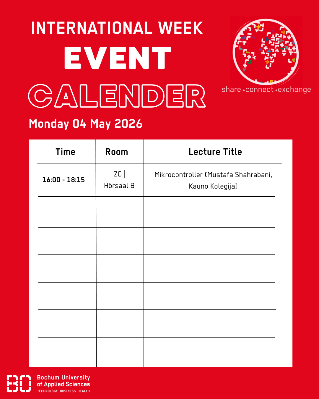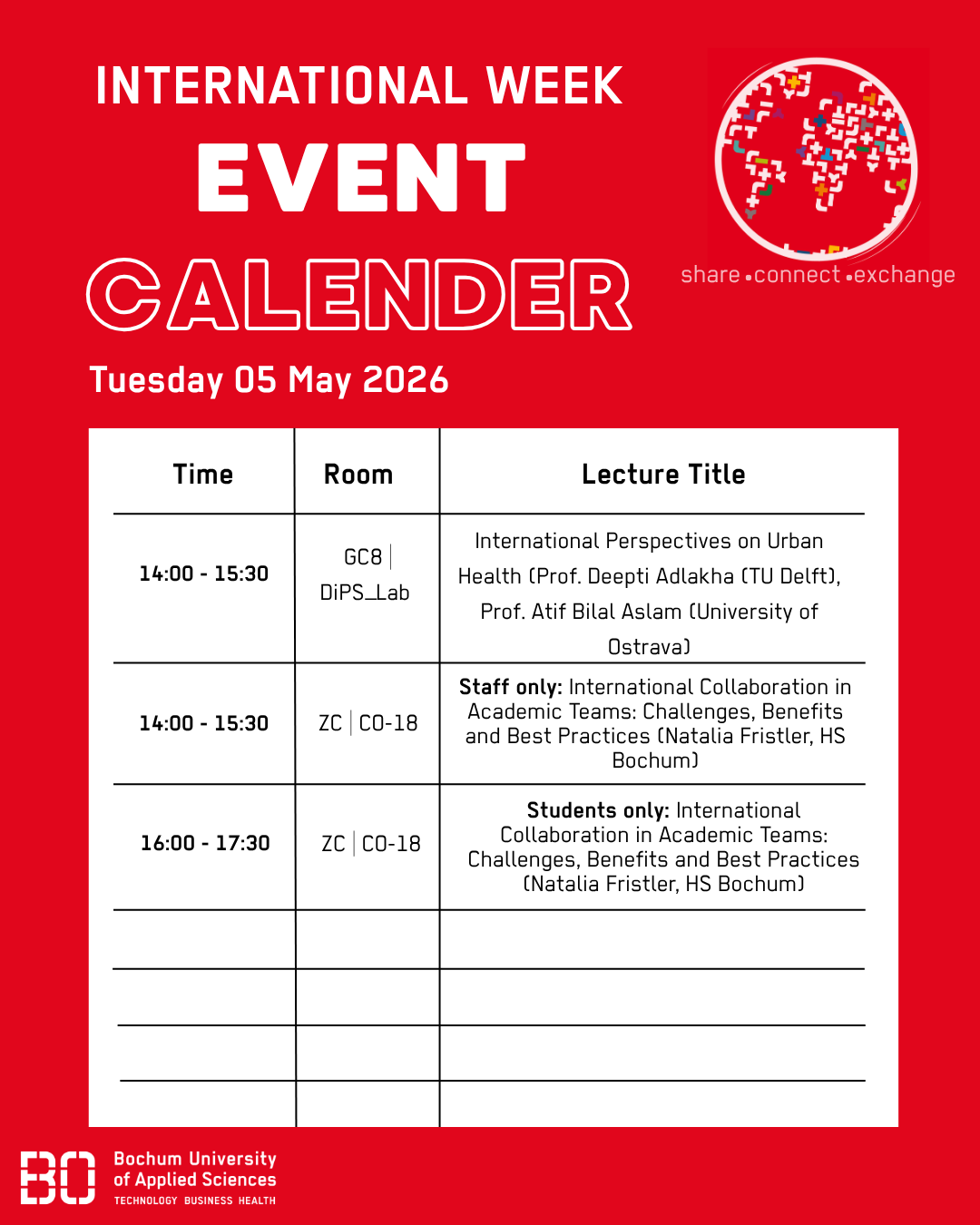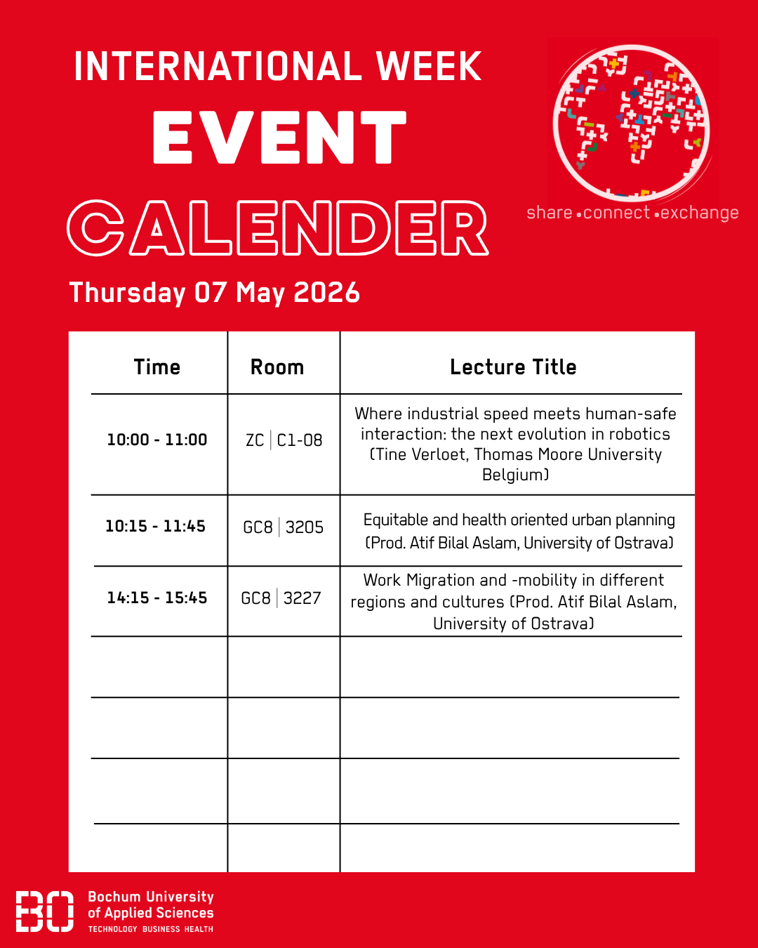 Die Veranstaltungen der International Week richten sich an alle Studierenden – unabhängig vom Fachbereich. Eine Anmeldung ist nicht erforderlich. Die Veranstaltungen sind offen, sofern die Raumkapazitäten es zulassen.