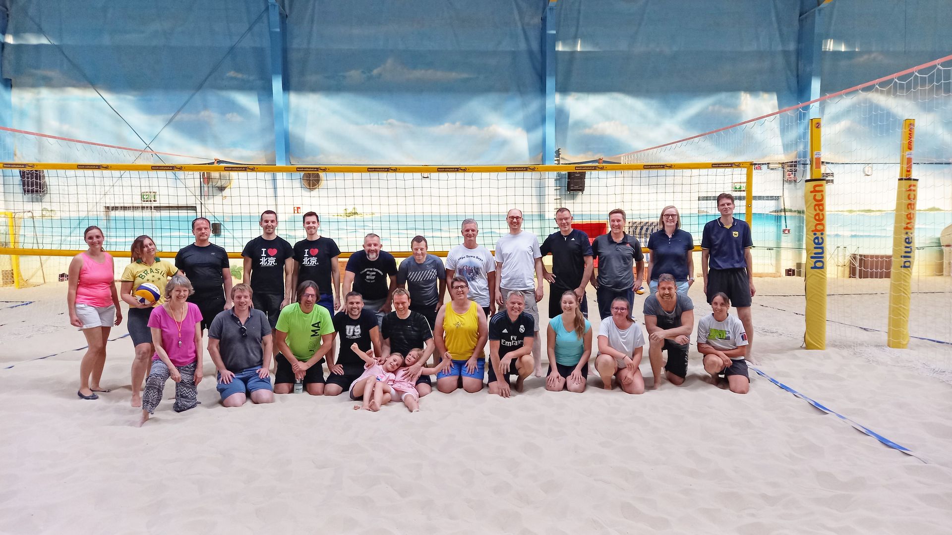 Doch von vorn: Am späten Nachmittag trafen sich die Mannschaften in der Beachvolleyballhalle in Witten und wurden in den Spielmodus eingewiesen. In den nächsten 2 Stunden kämpften die Teams im Modus jeder gegen jeden in einer Vorrunde um die Punkte. Die schöne Halle, Sand und wechselnde Gegner sorgten für gute (Urlaubs-)Stimmung und richtige Wettkampfatmosphäre bei schweißtreibenden Temperaturen über 30 Grad!