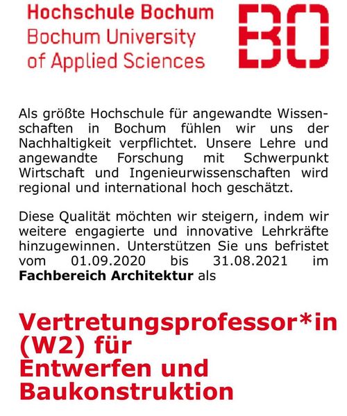 anybody? Vertretungsprofessur für Entwerfen und Baukonstruktion ausgeschrieben. Bewerbungsfrist 12.08.2020, siehe hier: https://karriere.hochschule-bochum.de/jobposting/3370bea8cdb1a1b6d6f9f0b33dadb23d3048ce60?ref=homepage . . . #hsbo ...
