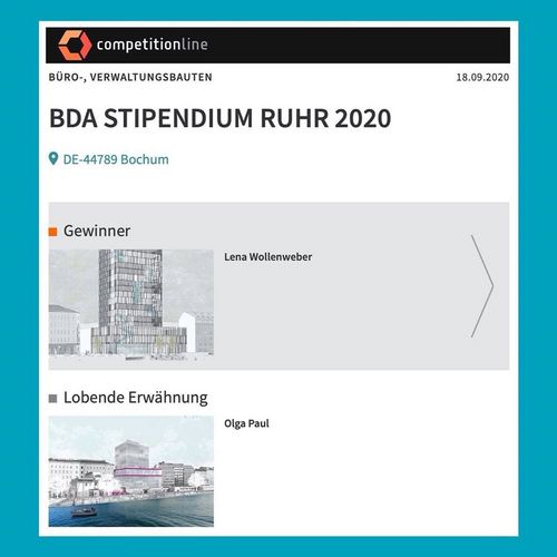 BDA RUHR STIPENDIUM 2020 auf competitionline veröffentlicht : @leni_wo Lena Wollenweber ist die erste Preisträgerin dieses neuen Stipendiums, das vom BDA Bochum, Hattingen, Herne, Witten in Kooperation mit der Hochschule Bochum ausgelobt wird. Die Jury unter dem Vorsitzenden Boris Biskamp zeichnete zudem die Arbeiten von Hannah Lantermann @hannahlantermann und Olga Paul @xo_olgaaa_xo mit einer Lobenden Erwähnung aus. Auch ihnen herzlichen Glückwunsch! Alle Arbeiten entstanden im Rahmen der Thesis und des Entwurfs Neuer Standard (WiSe 2019/20) an der @professurkinzelbach #bda #professurkinzelbach #hsbo #fba #bdaruhrstipendium @hsboarchitektur @zsb_hsbochum @hochschule_bochum @hochschule_bochum @bund.deutscher.architekten.nrw @graurosarot Quelle: @competitionline_verlags_gmbh