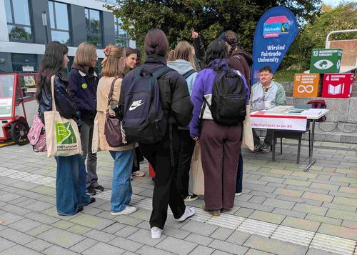 Das Nachhaltigkeits- und Klimaschutzmanagement freute sich über das große Interesse und die vielen Gespräche mit den neuen Studierenden. Aktionen wie diese verdeutlichen, wie eng fairer Handel, Klimaschutz und das Engagement der Hochschulgemeinschaft miteinander verbunden sind. Jede bewusste Entscheidung – ob im Studium oder im Alltag – kann dazu beitragen, eine nachhaltigere Hochschule und Gesellschaft zu gestalten.