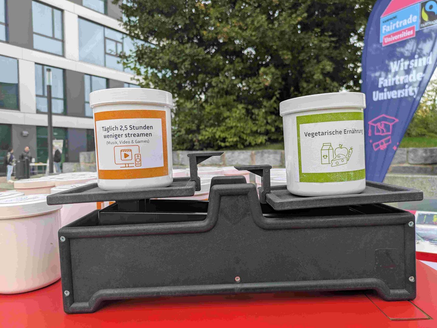 Ein anschauliches Gedankenspiel bot die Klimawaage: Studierende konnten ihre alltäglichen Konsumentscheidungen sprichwörtlich „auf die Waage legen“ und erfahren, wie sich verschiedene Maßnahmen und Handlungen in ihrer Klimawirkung unterscheiden.