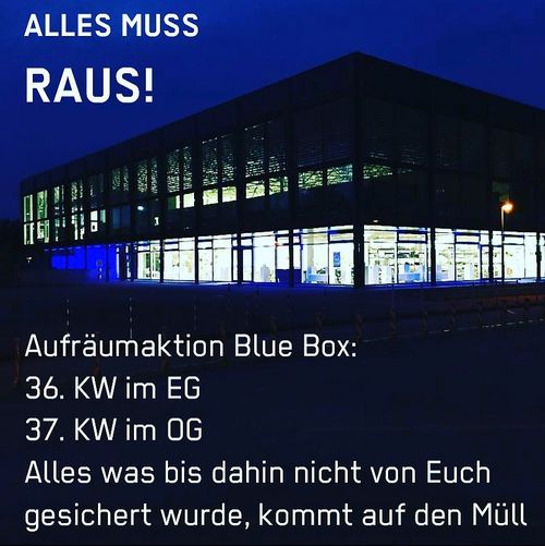 Source: instagram - ERINNERUNG!!! : die jährliche Aufräumaktion findet in KW 36 (EG) und KW 37 (OG) statt. Alles, was bis dahin nicht von Euch gesichert wurde (Material, Modelle etc.), kommt auf den Müll. Bitte beachtet auch, dass Ihr Eure Schließschränke räumen .