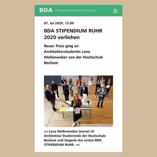 siehe BDA website: BDA RUHR STIPENDIUM 2020 - Lena Wollenweber @leni_wo ist die erste Preisträgerin dieses neuen Stipendiums, das vom BDA Bochum, Hattingen, Herne, Witten in Kooperation mit der Hochschule Bochum ausgelobt wird. Die Jury unter dem Vorsitzenden Boris Biskamp zeichnete zudem die Arbeiten von Hannah Lantermann @hannahlantermann und Olga Paul @xo_olgaaa_xo mit einer Lobenden Erwähnung aus. Auch ihnen herzlichen Glückwunsch! Alle Arbeiten entstanden im Rahmen der Thesis und des Entwurfs Neuer Standard (WiSe 2019/20) an der @professurkinzelbach #bda #professurkinzelbach #hsbo #fba #bdaruhrstipendium @hsboarchitektur @zsb_hsbochum @hochschule_bochum @hochschule_bochum @bund.deutscher.architekten.nrw @graurosarot Foto: Nicola Leffelsend/graurosarot