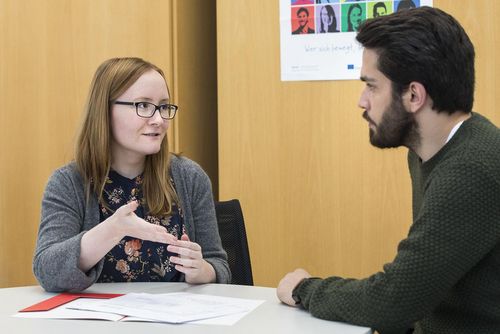 Nach ihrem Wirtschafts-Studium kam die Hannoveranerin Katharina Töws eigentlich nur für ein Praktikum nach Essen - blieb dann aber in der Region: Sie bewarb sich erfolgreich auf ihren Traumjob im Studierendenservice an der Hochschule Bochum: „Ich bin nun Teil eines Teams im International Office und kümmere mich beispielsweise um ausländische Studierende, die für ein oder zwei Semester an die Hochschule Bochum kommen.“ Sie informiere die ausländischen Bewerber über nötige Bewerbungsformulare und Dokumente und prüfe diese im Anschluss. Im positiven Fall lasse sie die Bewerber zum Studium zu.