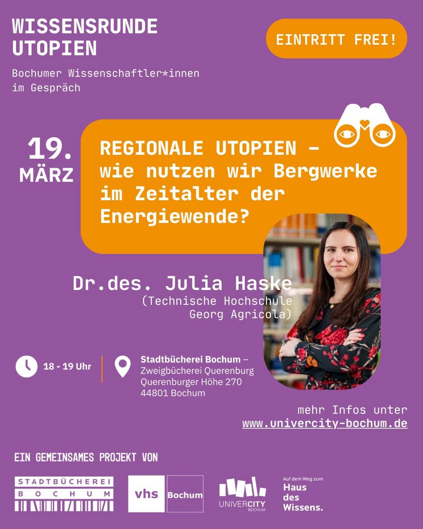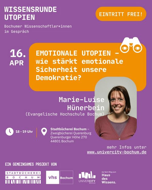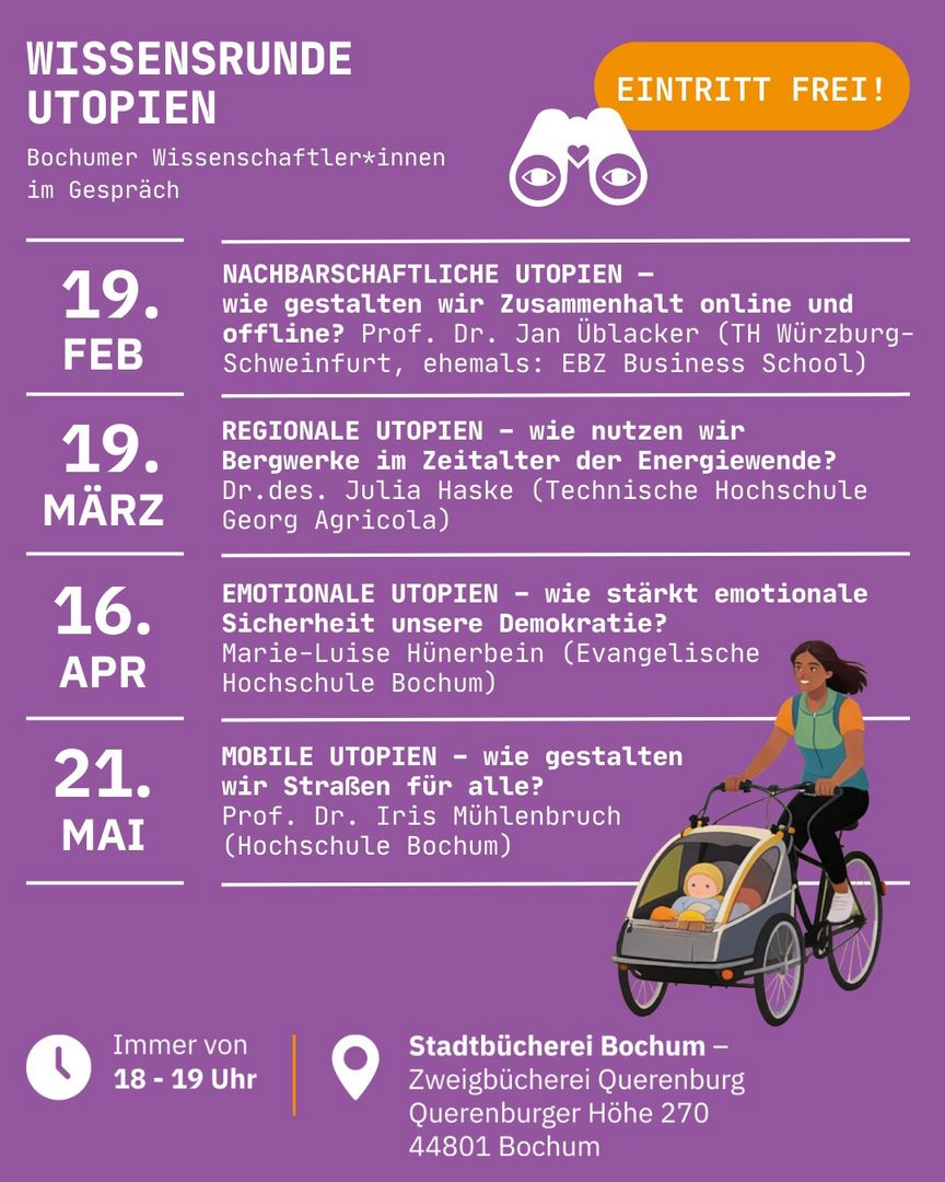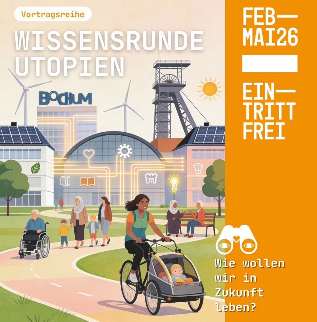 Zum zweiten Mal in Folge laden der UniverCity Bochum e.V., die vhs Bochum und die Stadtbücherei zur öffentliche Vortragsreihe „Wissensrunde“ ein. Fast jeden Monat sind hier Menschen aus der Bochumer Wissenschaft zu Gast, die Einblick in ihre Forschung geben und dazu mit dem Publikum ins Gespräch kommen. Nachdem sich 2025 in der Wissensrunde alles um das Thema Sicherheit drehte, steht 2026 ganz im Zeichen der Utopie!