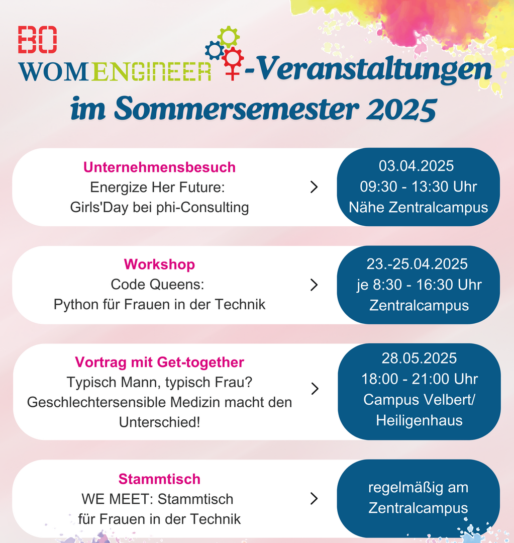 Im gerade gestarteten Sommersemester organisiert WomEngineer, das Netzwerk der Frauen in der Technik an der Hochschule Bochum, wieder vielfältige Veranstaltungen. Diesmal sind die Inhalte besonders bunt gemischt und es ist für jeden (auch die Männer!) etwas dabei: