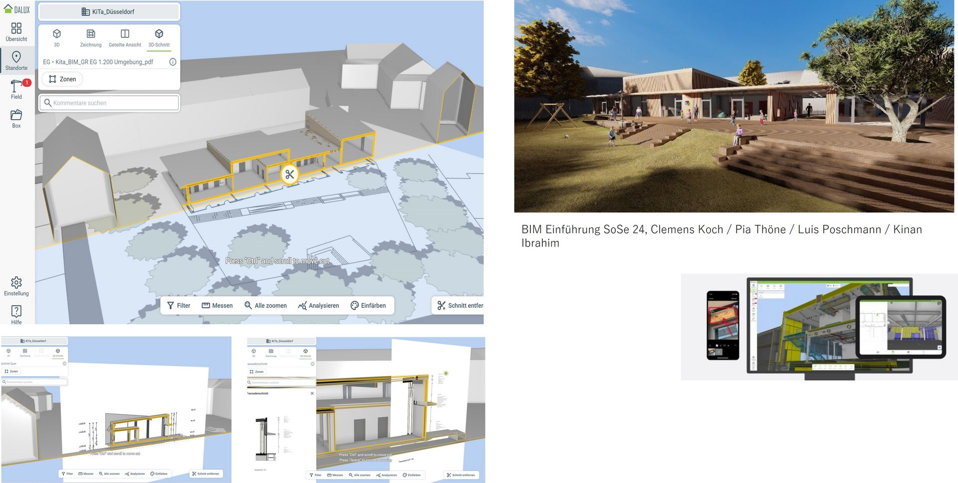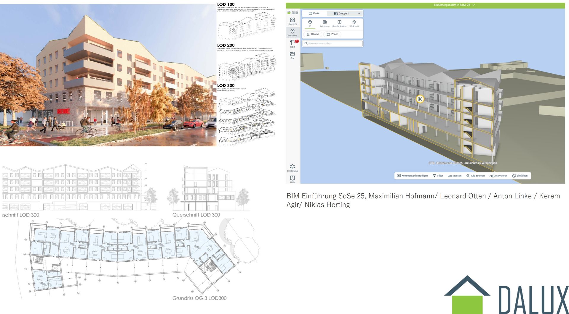 Im Modul Einführung in Building Information Modeling (jedes Semester) wird in Vorlesungen das Grundlagenwissen über BIM, sowie die unterschiedlichen Schlüsselterminologien und Begriffe, Rollen und Verantwortlichkeiten vermittelt. Darüber hinaus erhalten die Teilnehmer*innen anhand praktischer Übungen einen Überblick, wie BIM in einem Entwurfsprojekt eingesetzt wird. Dabei geht es um die Methodik der Anwendung digitaler Werkzeuge im interdisziplinären Zusammenhang. Daraufhin befassen wir uns mit Datenstrukturen und dem Datentransport zwischen dem von uns eingesetzten CAD-Programm ArchiCAD über die IFC-Schnittstelle zu anderen Softwareprodukten.
