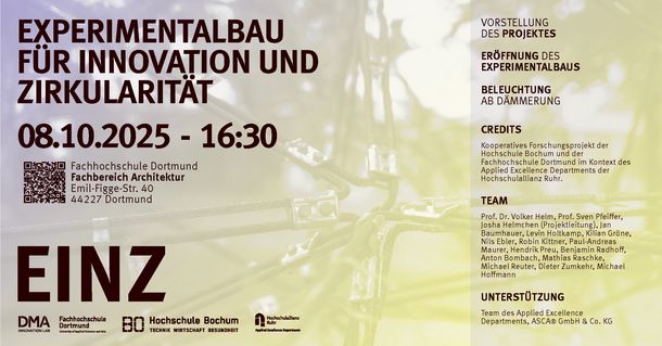 Das Kooperationsprojekt EINZ - Experimentalbau für Nachhaltigkeit und Zirkularität´von Prof. Sven Pfeiffer und Prof. Dr. Volker Helm (FH Dortmund, Digitale Methoden in der Architektur) im Rahmen des Applied Excellence Department (AED) untersucht die Integration von künstlicher Intelligenz (KI) in den Bereich der Architektur in Verbindung mit umweltverträglichen Materialien.