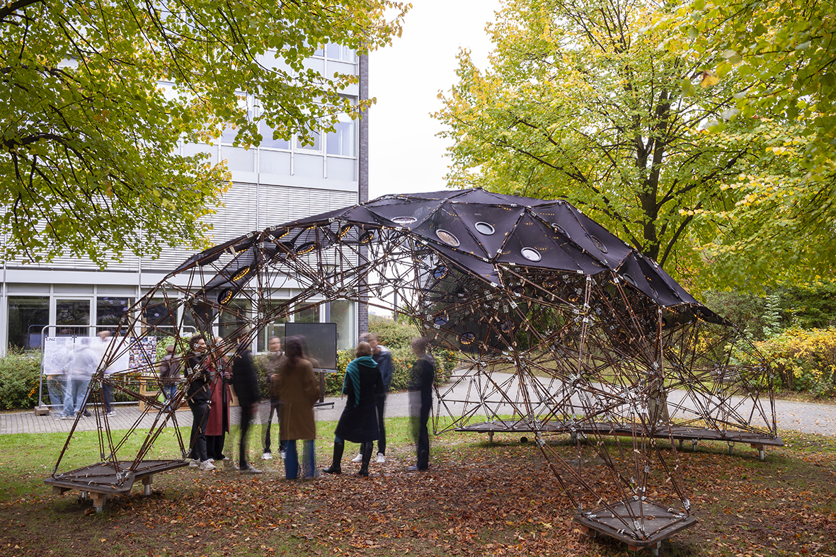 Das Kooperationsprojekt EINZ - Experimentalbau für Nachhaltigkeit und Zirkularität verfolgte das Ziel, durch Methoden der Künstlichen Intelligenz (KI) und digitalen Fertigung den Einsatz von Restmaterialien in der Architektur zu erforschen. Um dieses Potenzial zu nutzen müssen KI-Anwendungen in der Lage sein, nicht nur materielle Informationen als Trainingsdaten zu unterstützen, sondern auch einen Output zu generieren, der eine Weiterentwicklung für das Bauen ermöglicht. Bislang fehlt eine prototypische Anwendung dieser Technologien im Baukontext, die wiederum eine Optimierung der verwendeten KI-Workflows ermöglicht. Diese sollte im Projekt durch einen durchgehenden Prozess vom Vorentwurf bis hin zu einem 1:1 Enddemonstrator aus Bewehrungsstählen untersucht wurden. Der Demonstrator wurde mithilfe von KI und generativen Entwurfsmethoden geplant und auf dem Campus des Fachbereichs Architektur der Fachhochschule Dortmund realisiert (Standort: Emil-Figge-Straße 40, 44227 Dortmund – direkt vor dem Gebäude).