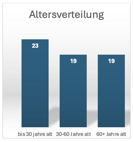 In den Tagen vor dem Erntefest im Herbst 2024, liefen Studierende der Hochschule mit ihrer Professorin Dr. Petra Schweizer-Ries durch Bochum-Hamme und befragten an vielen Türen die Anwohnenden zur KS. Dabei warben sie auch für die Nutzung der Kräuterspirale und die Beteiligung am Erntefest. Daher nennen wir es informierende Befragung. Im Idealfall wirkt es wie eine sensibilisierende Befragung, d.h. dass die Menschen darauf aufmerksam gemacht werden, die KS zu nutzen. Wir erhoben neben Alter und Geschlecht, ob die Kräuterspirale (KS) bekannt war, ob diese schonmal besucht wurde und ob die Befragten bereits, etwas von der KS gepflückt hatten. Zudem fragen wir nach dem Interesse, in Zukunft an der KS mitzuwirken. Insgesamt wurden 61 Personen befragt und 14 gaben prinzipielles Interesse an mitwirken zu wollen. Das ist fast ein Viertel der Befragten und freute uns sehr!