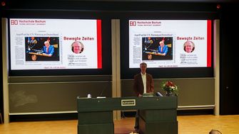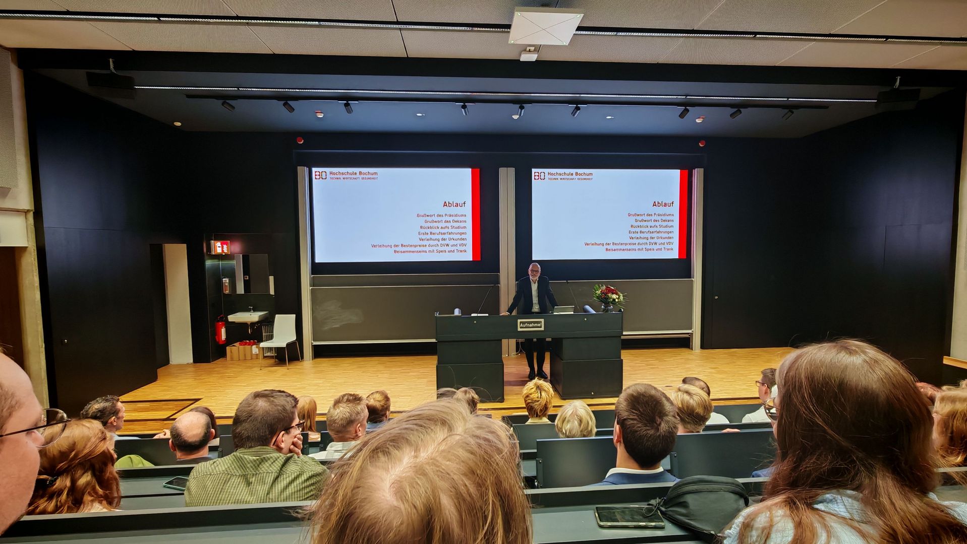 Besonders herzlich begrüßt wurden die Gäste vom Präsidenten der Hochschule Bochum, Prof. Dr. Andreas Wytzisk-Arens, der selbst einige Jahre als Professor und Dekan den Fachbereich geprägt hat. In seiner Ansprache – ergänzt durch Worte des aktuellen Dekans, Prof. Dr. Dirk Eling, – wurde der Bogen gespannt von den besonderen Studienanfängen in Zeiten der Corona-Pandemie über die rasant voranschreitende technische Entwicklung bis hin zu aktuellen geopolitischen Fragen und den Chancen wie Herausforderungen der Künstlichen Intelligenz.