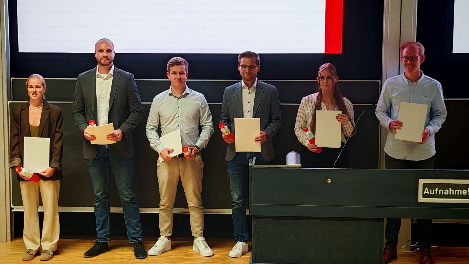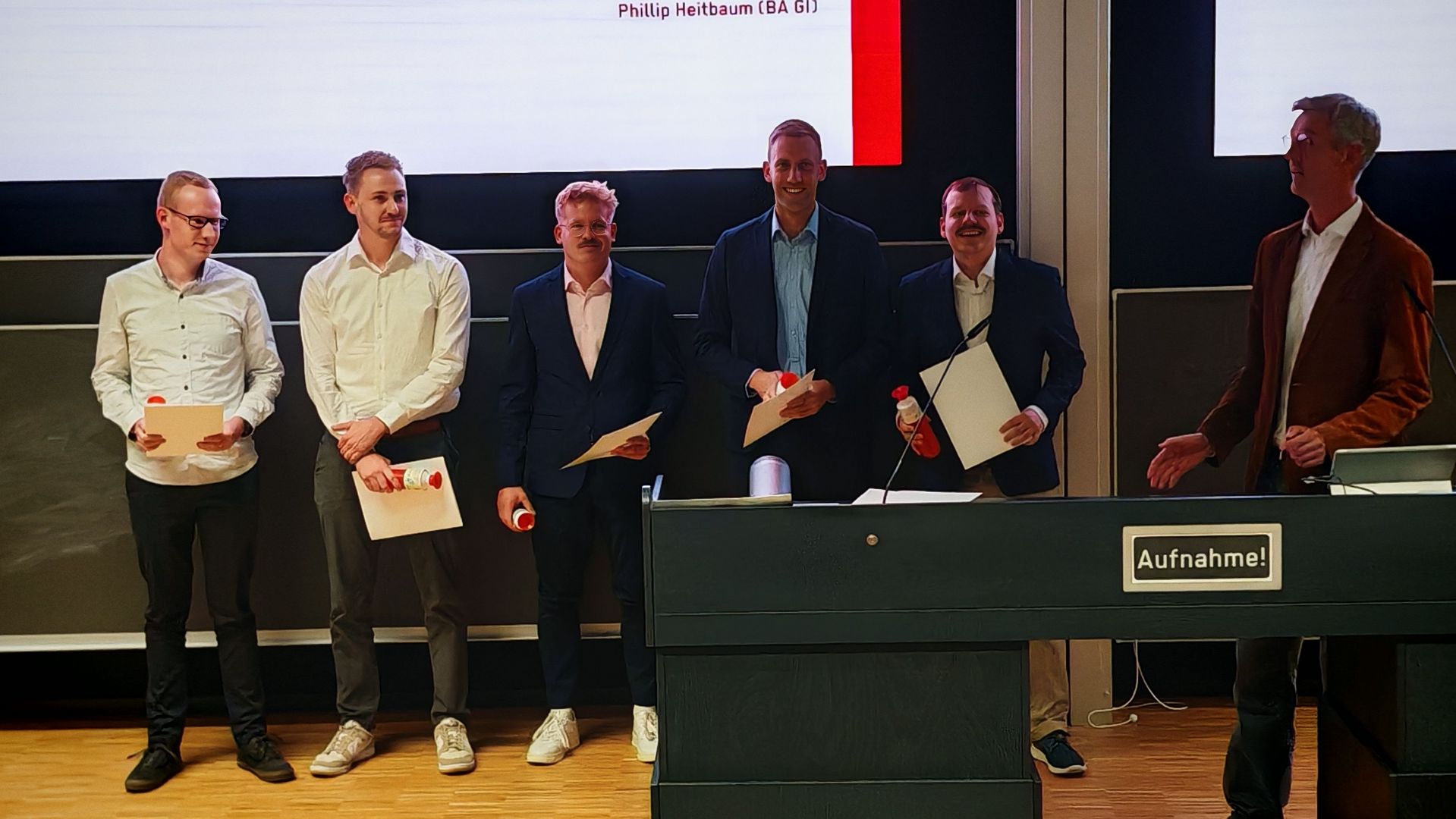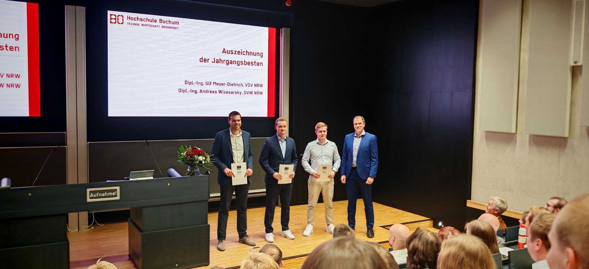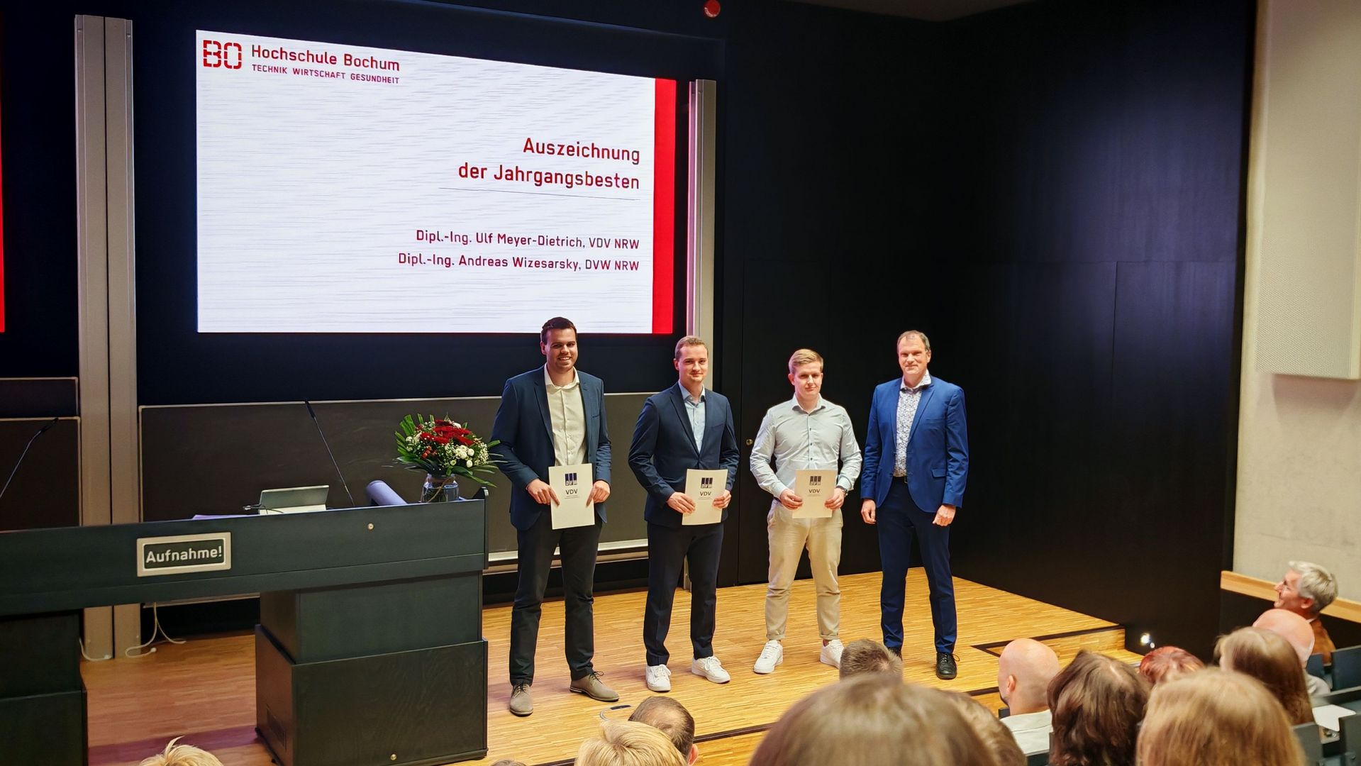 Traditionell folgte die Ehrung der Jahrgangsbesten durch die Berufsverbände DVW NRW und VDV NRW. In diesem Jahr durften sich Nils Köpke (BA Geoinformatik), Lennart Kötters (BA Vermessung) und Marian Jannis Schneider (MA Geodäsie) über die Auszeichnungen freuen.