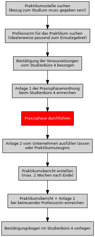 Die Praxisphase ist im Umfang von mindestens 10 Wochen nachzuweisen. Sie ist in Unternehmen, Behörden, wissenschaftlichen Einrichtungen u.ä. im In- oder Ausland abzuleisten. Die Praxisphase wird unbenotet testiert. Die Anmeldung zur Praxisphase kann erfolgen, sobald die Voraussetzungen gemäß der Studiengansprüfungsordnung § 9 Absatz 3 vorliegen.