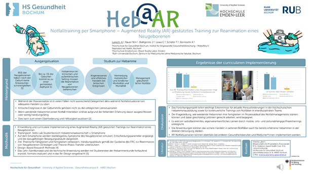 - 3. Posterpreis 6. Internationale Konferenz Deutsche Gesellschaft für Hebammenwissenschaft (DGHWi e.V.) 28.-29.07.2022, Winterthur (Schweiz). Augmented Reality gestütztes Lernen in der hochschulischen Hebammenausbildung (Heb@AR) – Welche Unterstützung benötigen Lehrende?/ Augmented Reality based training for student midwives (Heb@AR) – what kind of support do teachers need?. (DGHWi e.V.)